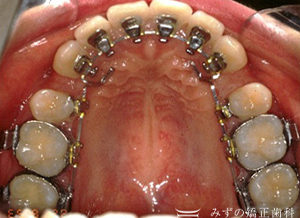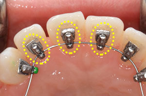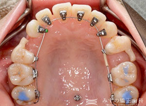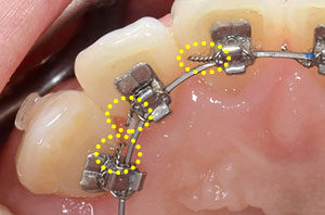 上の写真のように、歯の裏側につけた装置を結紮しています。