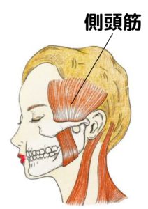 咀嚼筋のひとつである ” 側頭筋 ” はその名の通り頭の側面にある筋肉です。