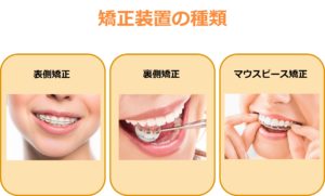 透明のマウスピースを使った矯正方法や、歯の裏側に器具を装着するものなど、