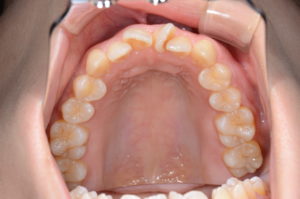 噛み合わせが深く、上の前歯によって下の前歯がほとんど見えなくなる